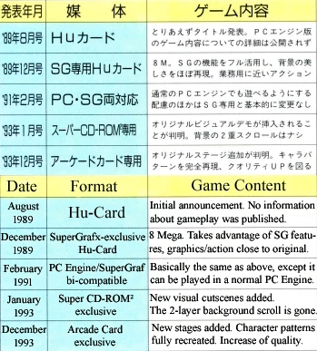 In July of 1994, in an interview with gaming magazine Edge, NEC Avenue's Multimedia Division manager Kimihisa Usui claimed that both the SuperGrafx's low sales due to its high price point and publishers' lack of support for the system caused NEC to produce a standard PC Engine port instead. At a later date, they decided to use the Arcade Card feature to improve the conversion[2]. Finally, this port was released as a regular CD-ROM² for the Arcade Card in September 1994, a full four years after the SuperGrafx HuCard's announcement in PC Engine Fan.[14]